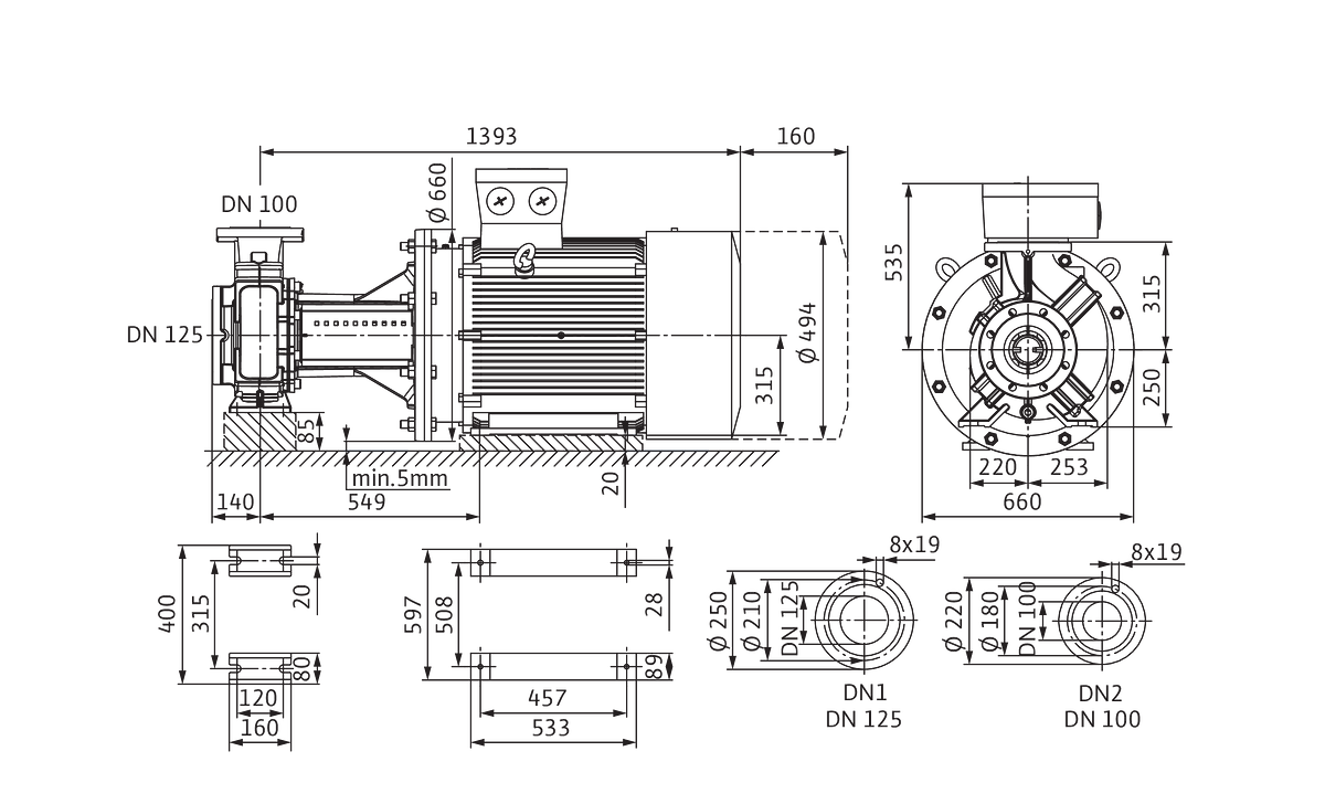 - Nom. diameter aansluiting inlaatzijde: DN 125