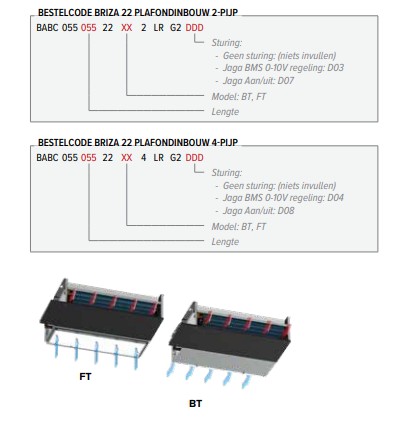 Ventilatorconvector BRIZA 22 plafondinbouw 2-pijp H055 L075 T22 FT links/rechts G2 Jaga BMS 0-10V regeling Jaga