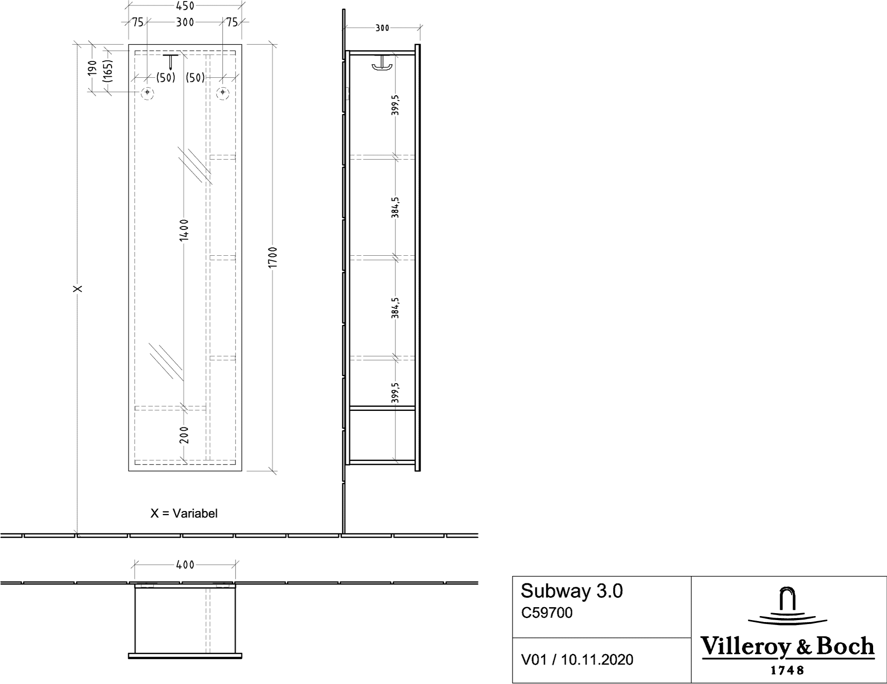 Afl.plank+spiegel Subw.3.0 450x1700x300mm Cash.Grey C59700VN Villeroy & Boch