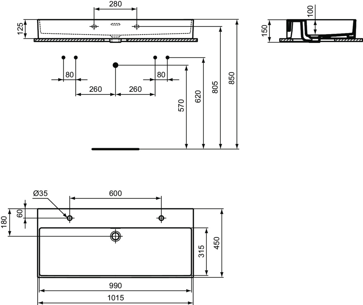 Wastafel 1015x450x150mm wit 2 kraangaten m. overloop Extra R055001 Ideal Standard