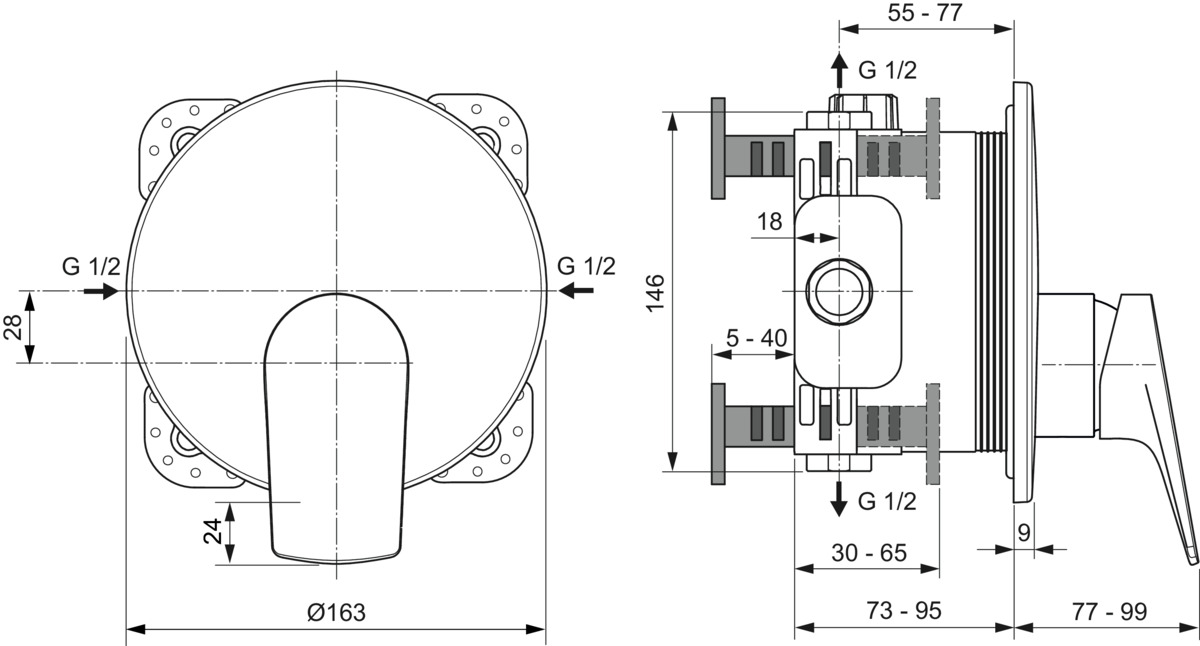 • Inbouwdiepte: 73 - 95 mm