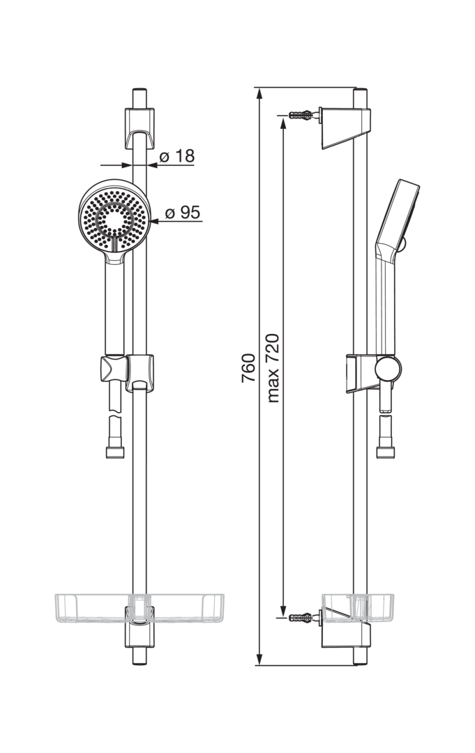 Glijstangset Basicjet 3 straalsoorten 720mm chroom m.slang 1750mm HANSA