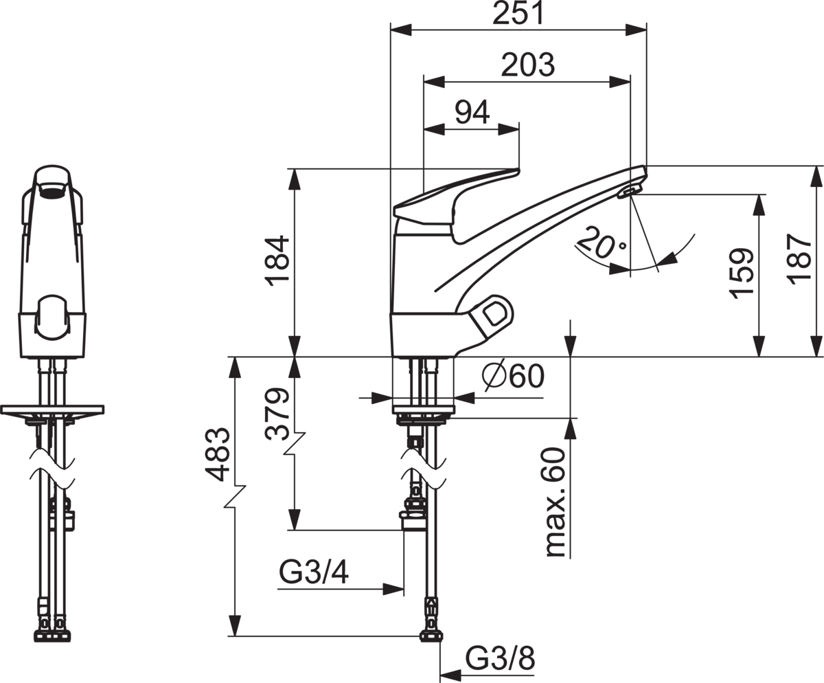 - Voorsprong uitloop: 203 mm
