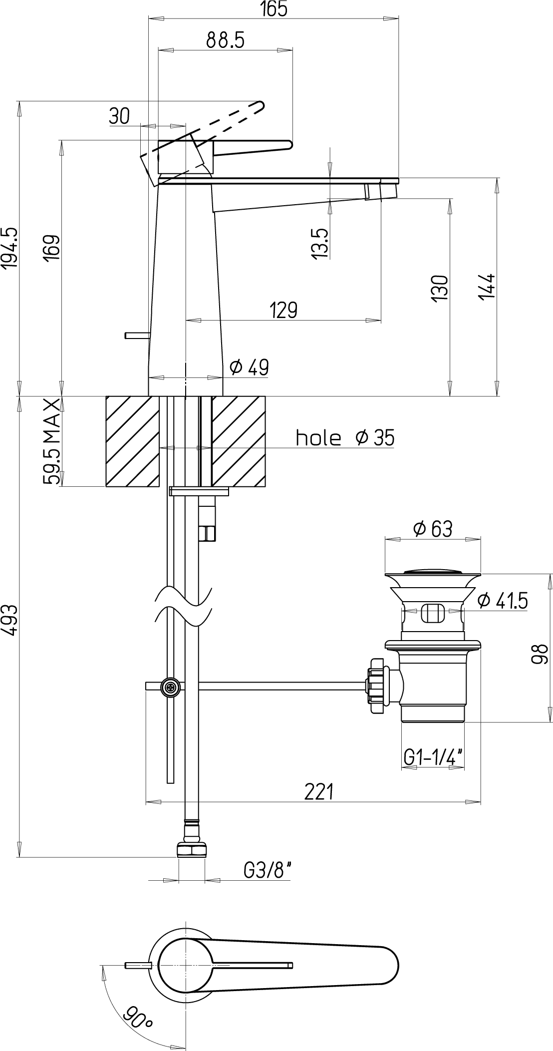 • Opbouwhoogte onderkant kraanmondstuk: 130 mm