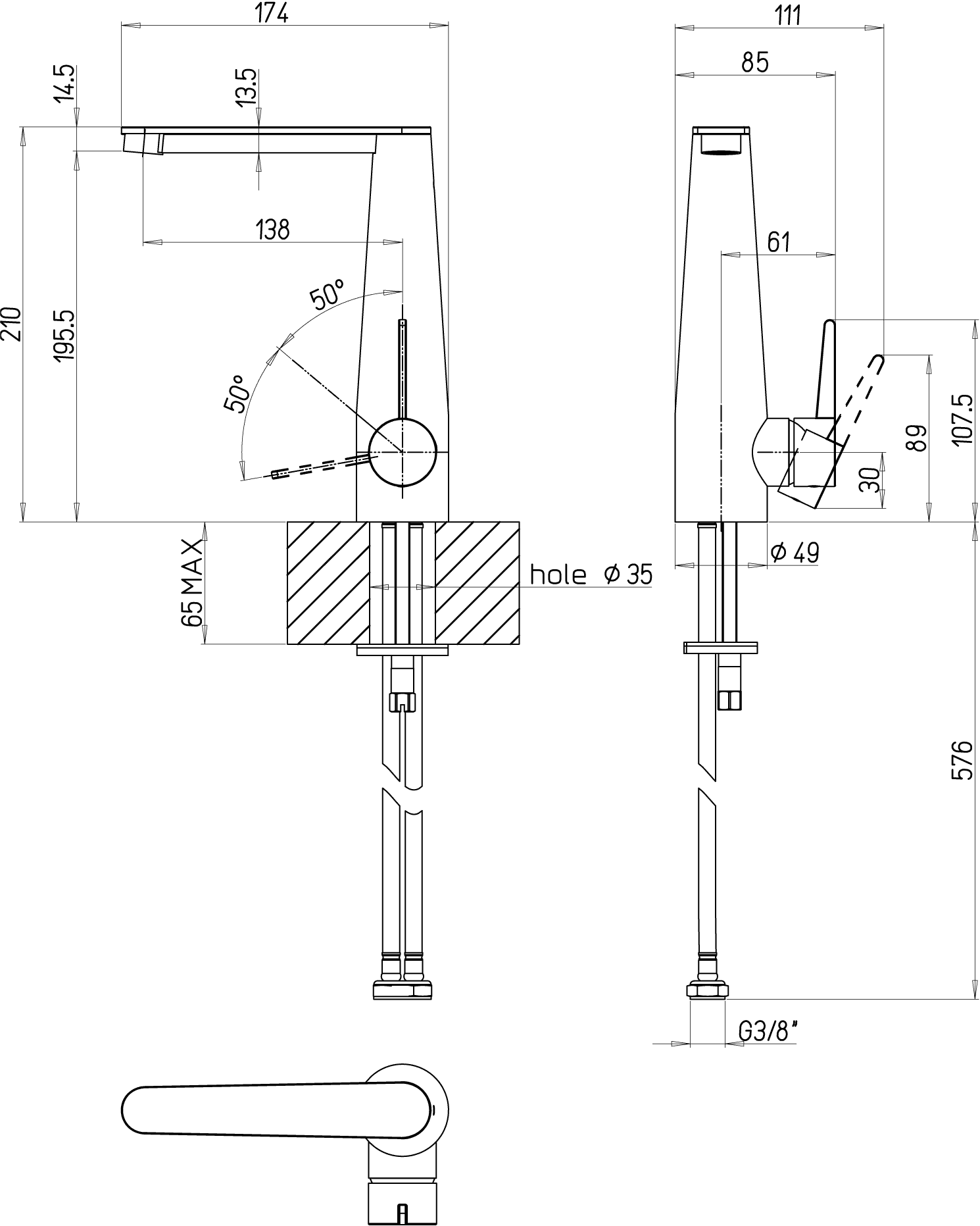 - Opbouwhoogte onderkant kraanmondstuk: 195,5 mm