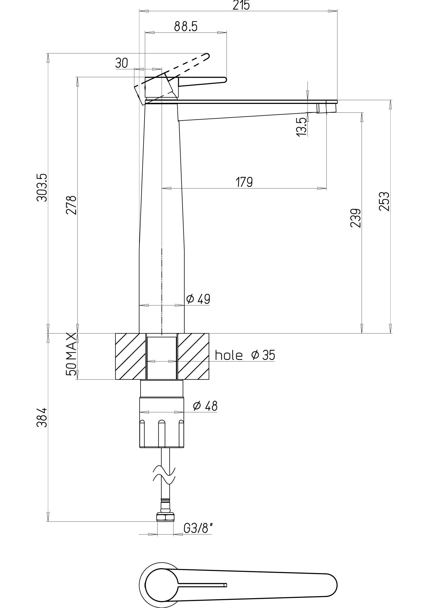 - Opbouwhoogte onderkant kraanmondstuk: 239 mm