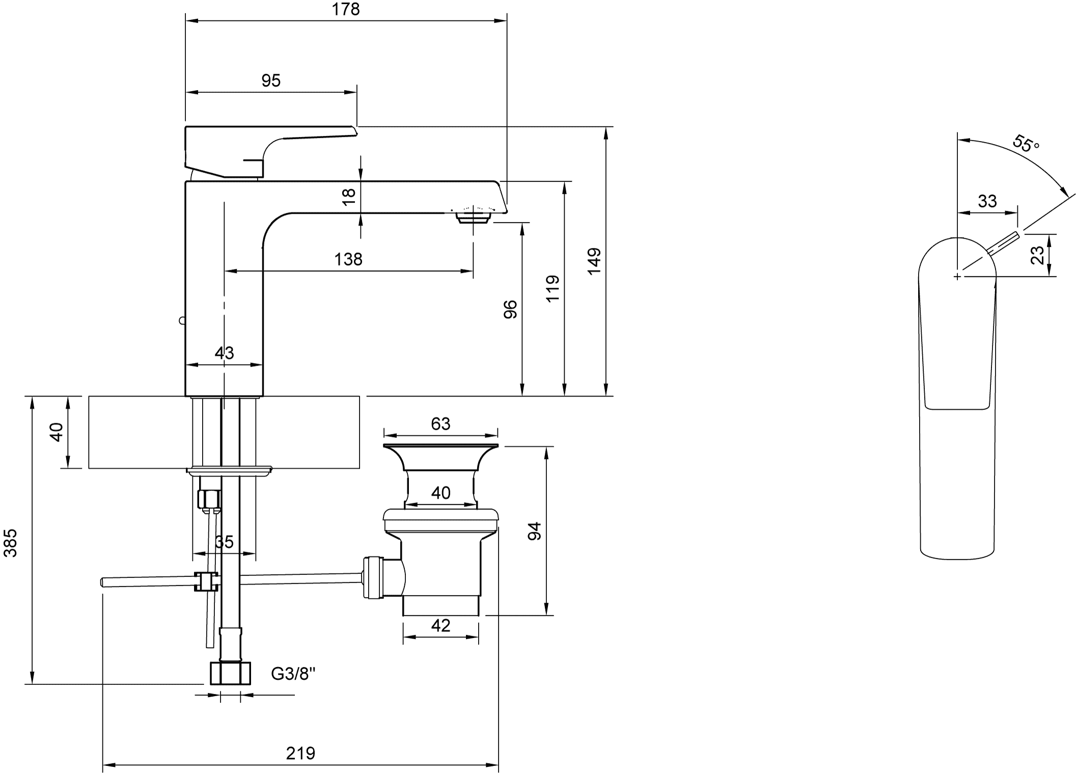 - Opbouwhoogte onderkant kraanmondstuk: 98 mm