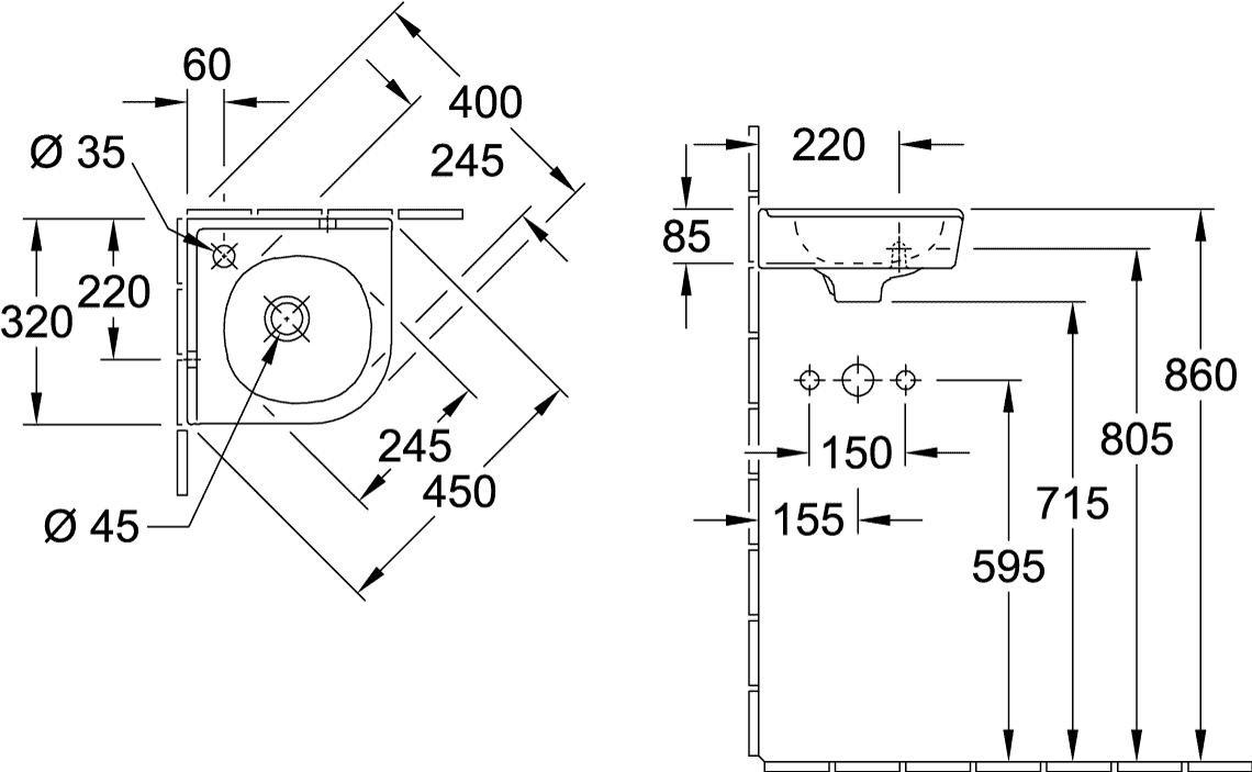 Hoekfontein O.novo 320mm zijlengte 731032R1 Villeroy & Boch